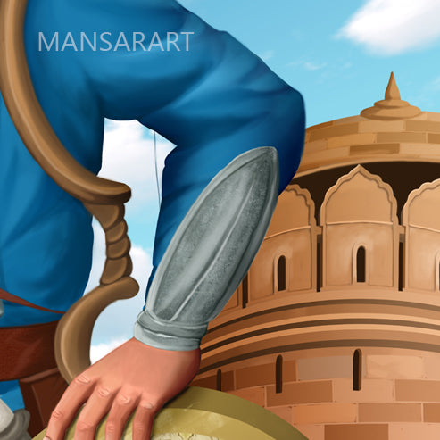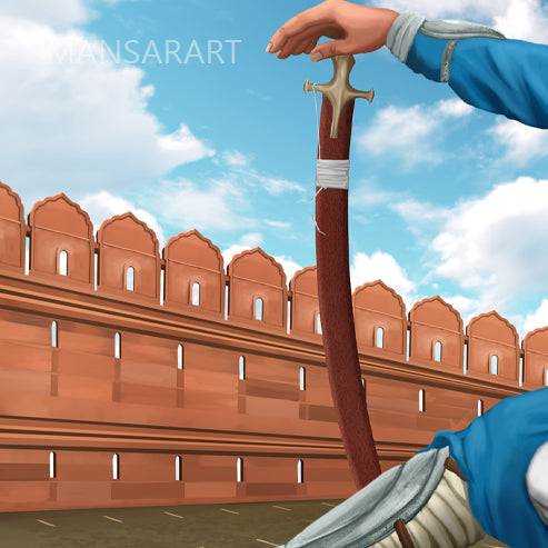 We have created a realistic artwork featuring Banda Singh Bahadur, against the back drop of a red sandstone wall of a Fort.