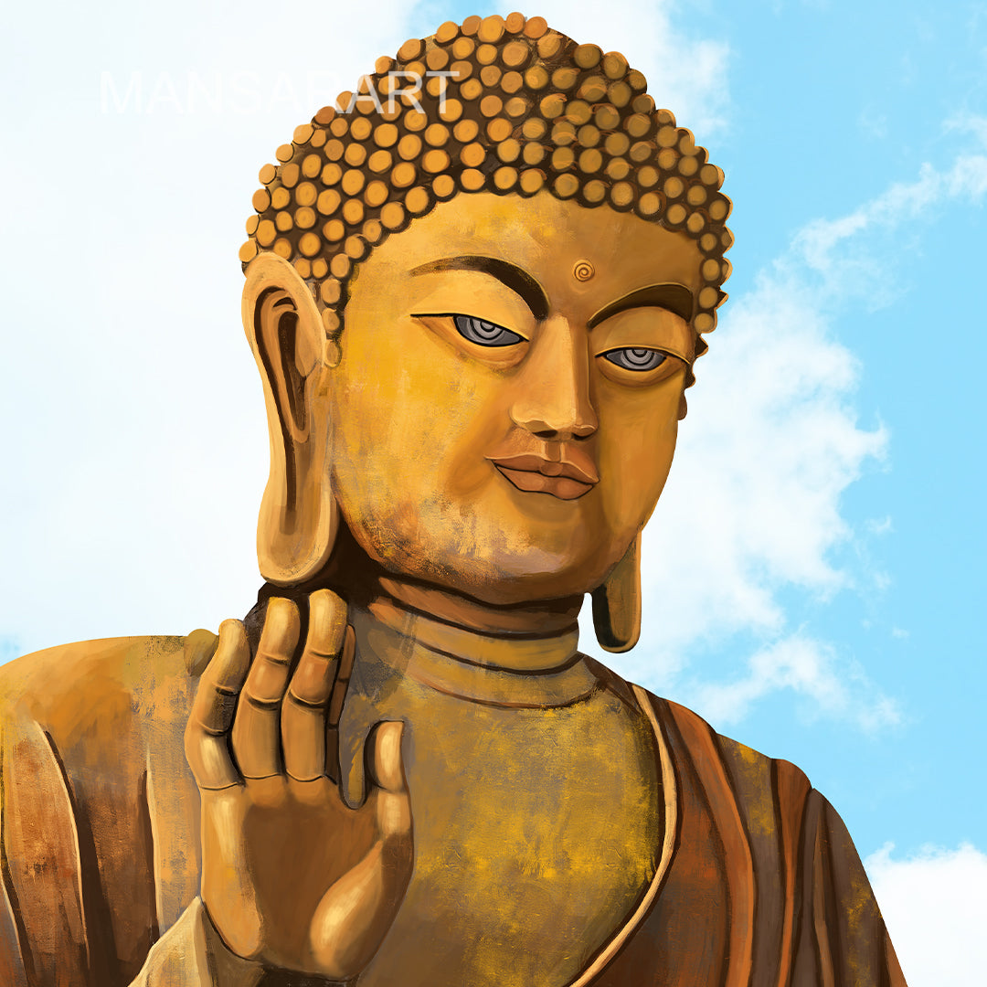 In the image, the Buddha’s right hand is raised in the Abhaya Mudra, a gesture that symbolizes protection, reassurance, and the dispelling of fear. This mudra is often associated with the Buddha’s teaching and his role as a protector and guide on the path to enlightenment.