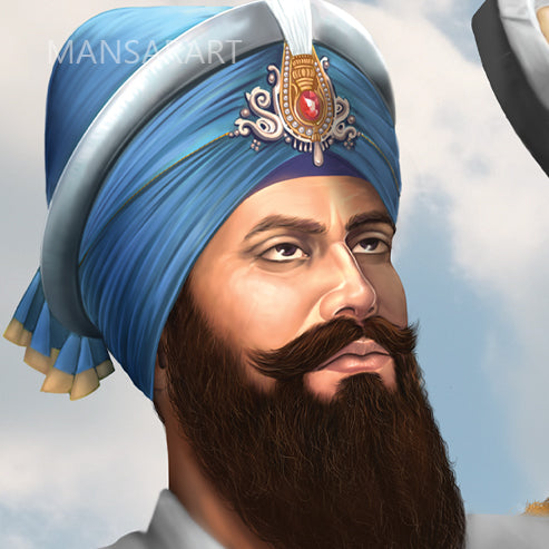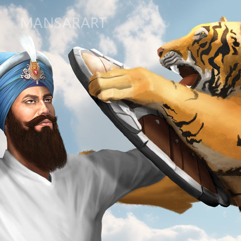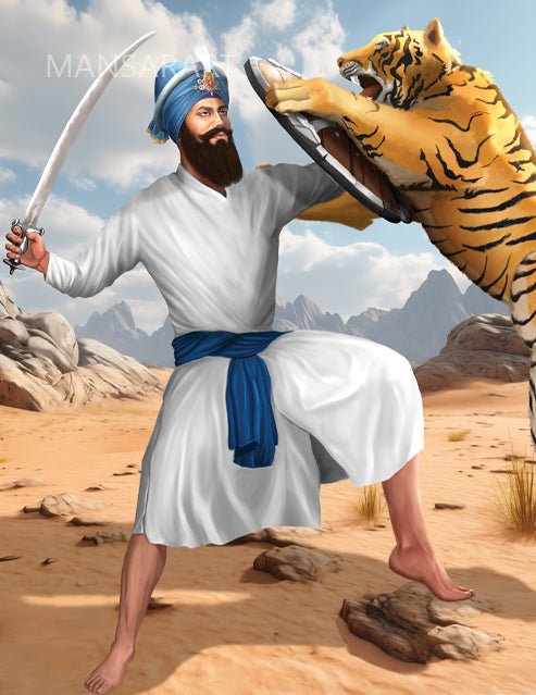 This realistic artwork shows the story behind Guru Gobind Singh fighting a tiger. The story of Guru Gobind Singh fighting a tiger is a legendary tale that showcases the Guru's exceptional bravery and divine protection. According to Sikh tradition, the incident took place during Guru Gobind Singh's stay at Anandpur Sahib, a significant Sikh pilgrimage site in Punjab, India.