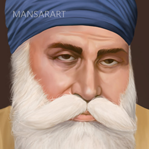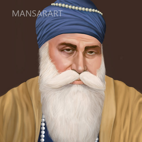 This artwork shows Guru Nanak Dev ji seated with prayer beads in his hand. The art style used in creating the artwork is realistic.