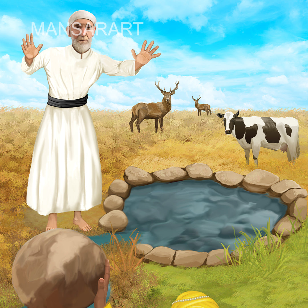 Bhai Mardana, the devoted companion and musician of Guru Nanak, is shown in the artwork. Wali Qandhari is depicted in the background, showcasing his astonishment or opposition, which contrasts with Guru Nanak's calm and divine demeanor.