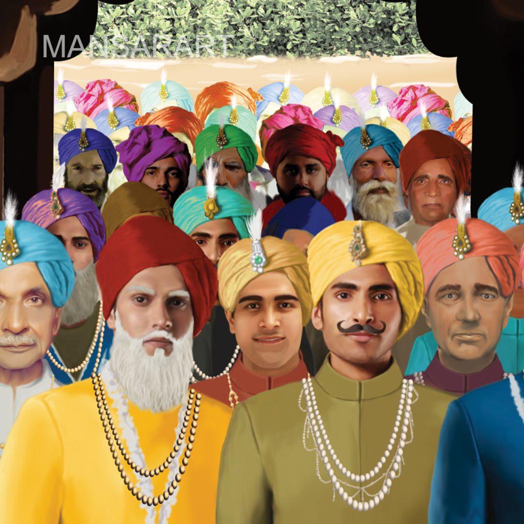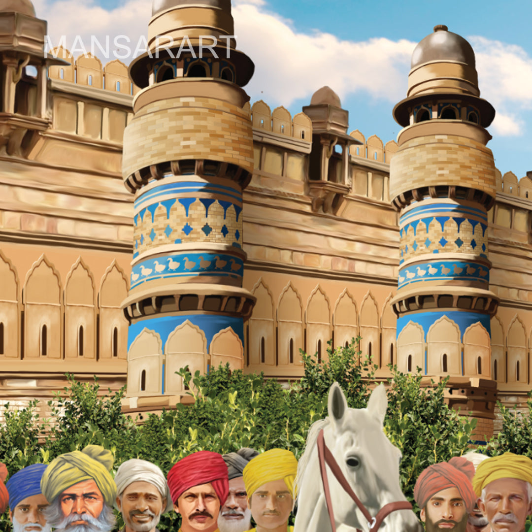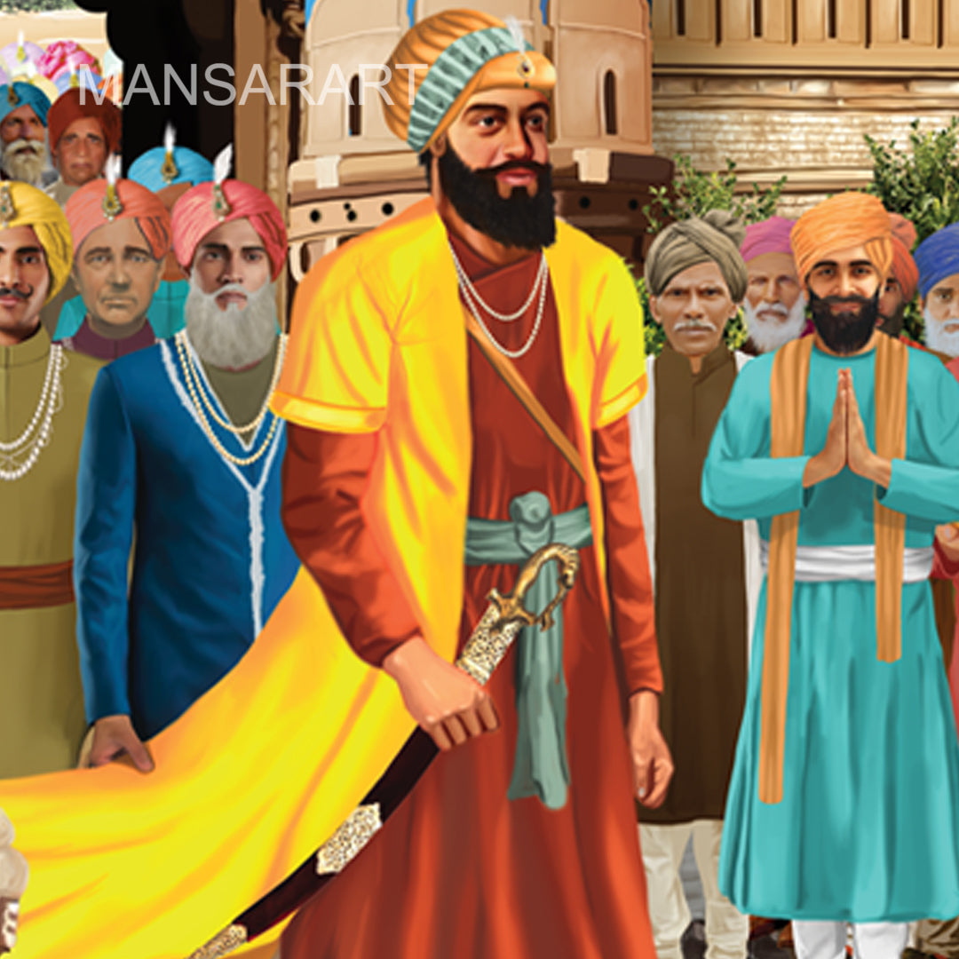 The realistic artwork depicts the historical event in Sikh history "Bandi Chhor".